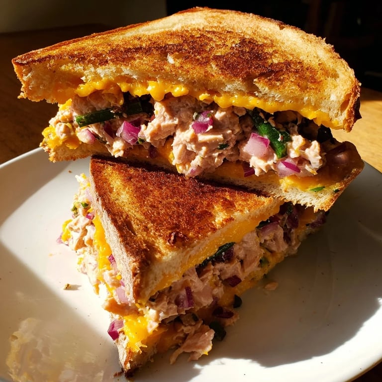 Save A golden, crispy sandwich filled with creamy tuna salad and gooey melted cheese — the perfect quick and satisfying snack.