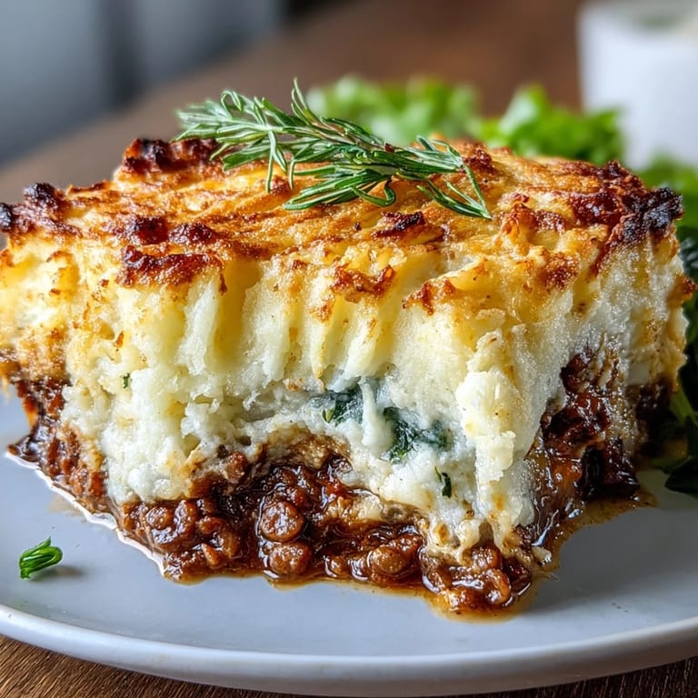 For a vegan version, use plant-based milk and vegan butter in the mashed potatoes. Feel free to add chopped parsnip or sweet potato to the mash for variety and a subtle sweetness. You can also experiment with different lentil varieties—red lentils will break down more and create a smoother filling, while French green lentils hold their shape beautifully. For extra richness, stir a tablespoon of miso paste into the filling along with the soy sauce. If you're gluten-free, simply use tamari instead of soy sauce.