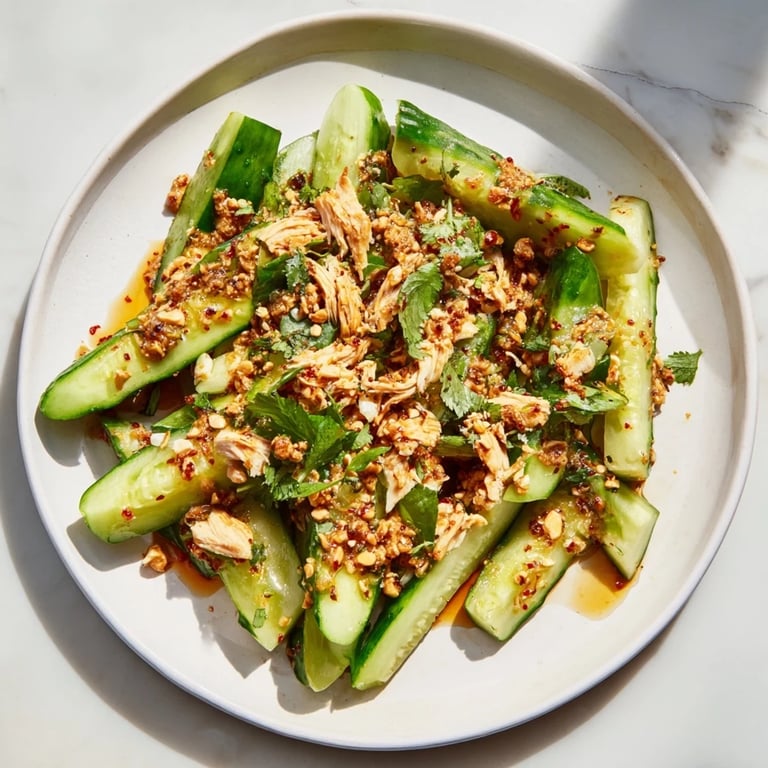 Save I threw this together on a Wednesday night when the fridge looked sad and I was too tired to think. A video kept popping up on my feed, people smashing cucumbers with their fists and dumping spices on top like it was some kind of produce therapy. It looked chaotic and oddly satisfying. I had two stubby Persian cucumbers rolling around in the crisper and half a rotisserie chicken from the weekend, so I figured why not. The whole thing took less time than scrolling through dinner ideas, and I ended up eating it straight out of the bowl, standing at the counter, feeling weirdly accomplished.